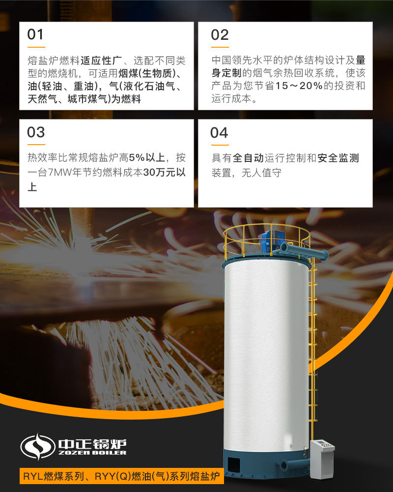 熔鹽爐是以熔化的硝酸鉀、亞硝酸鈉等的混合物為傳熱介質的鍋爐。熔化爐將粉狀的熔鹽加熱到熔點以上,直到熔鹽的粘度可以用循環泵推動,使整個系統成為流動可循環狀態后,送到熱載體爐進一步循環升溫,使其在流動狀態下循環使用。常用介質工作溫度為400-550℃,最高工作溫度可達600℃。